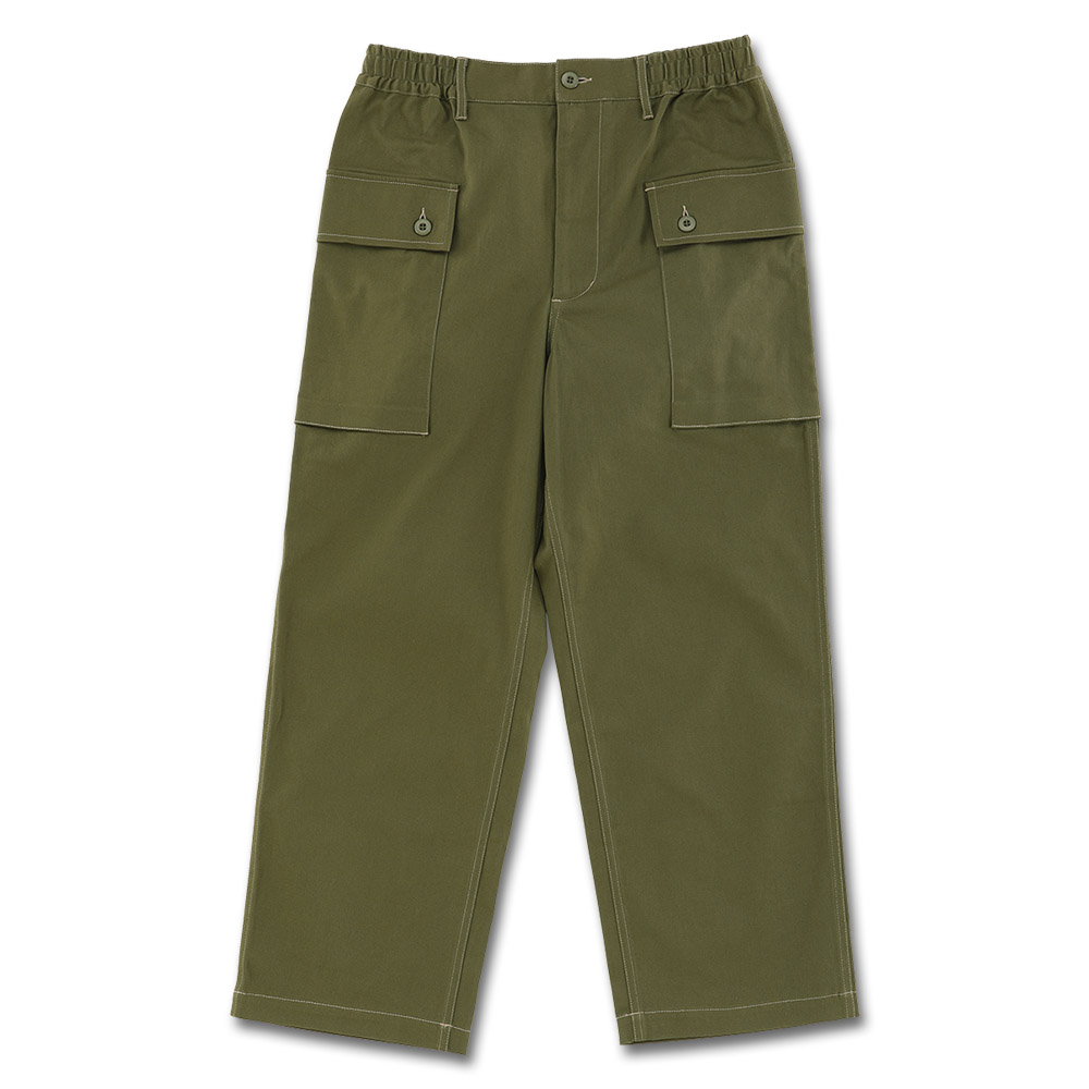 お尻に付いた大きなポケットが最大の特徴で、ミリタリーな雰囲気を感じさせる極太シルエットに、ペンキ風のCarpロゴを大胆にプリント。
