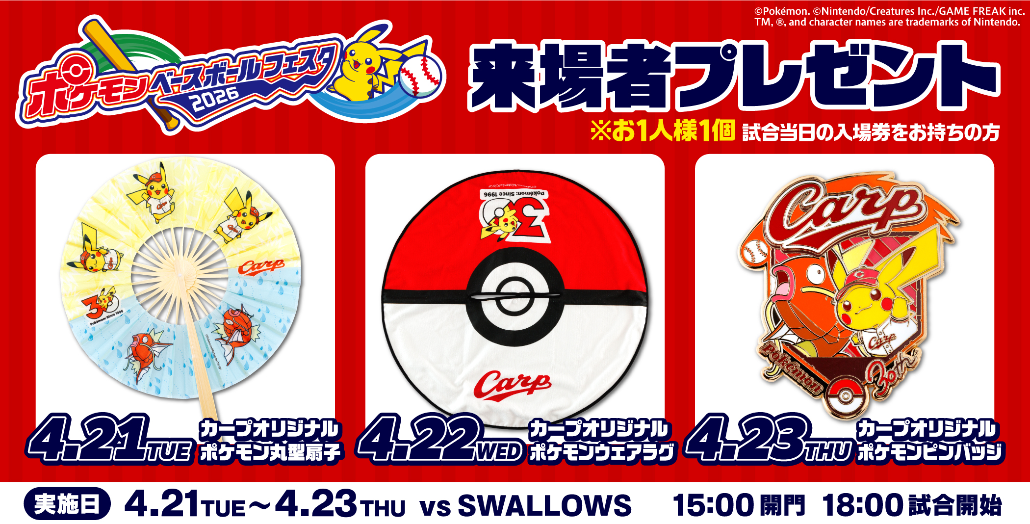 ◆4/23(木)に配布予定の商品は、「カープオリジナル ポケモンピンバッジ」!