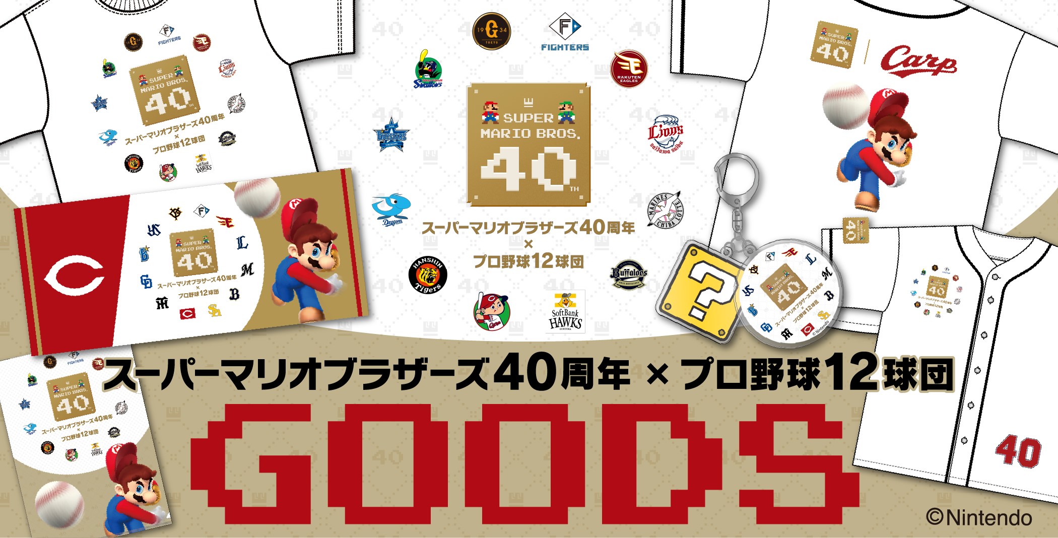 『スーパーマリオブラザーズ』が2025年9月13日で40周年を迎えたことを記念して実施される「スーパーマリオブラザーズ40周年×プロ野球12球団」オリジナルグッズの販売を、5月1日(金)午前11時より開始いたします。