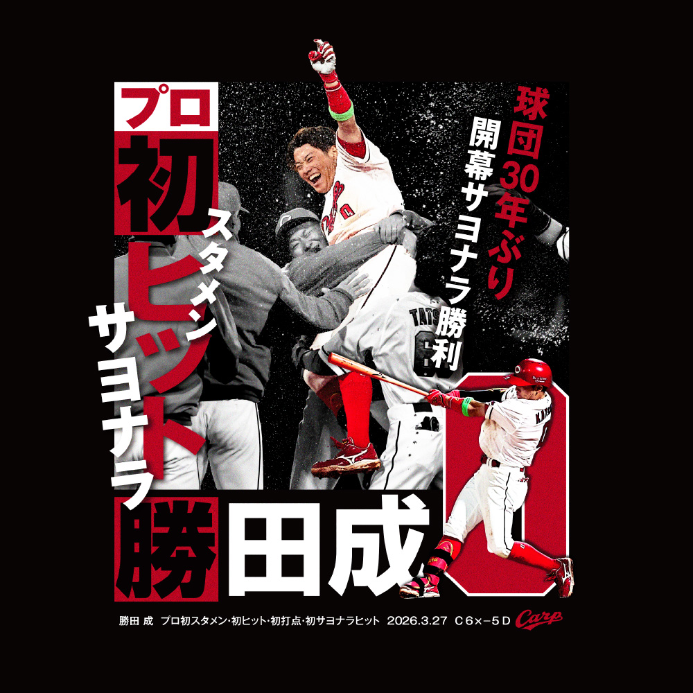 Tシャツには、勝田選手がプロ初となるサヨナラヒットを放ったフォロースルーと、仲間たちから熱い祝福を受ける姿をデザインしました。