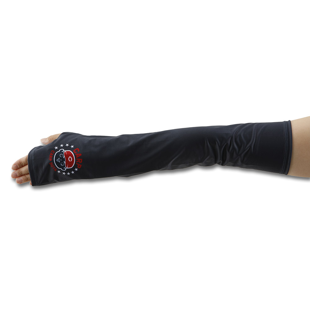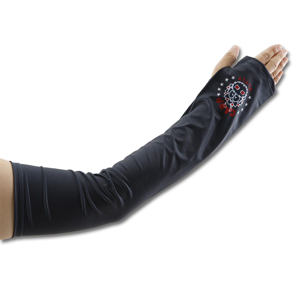 切り込みから親指を出して、手の甲まで日差しから守ってくれるアームカバーです。