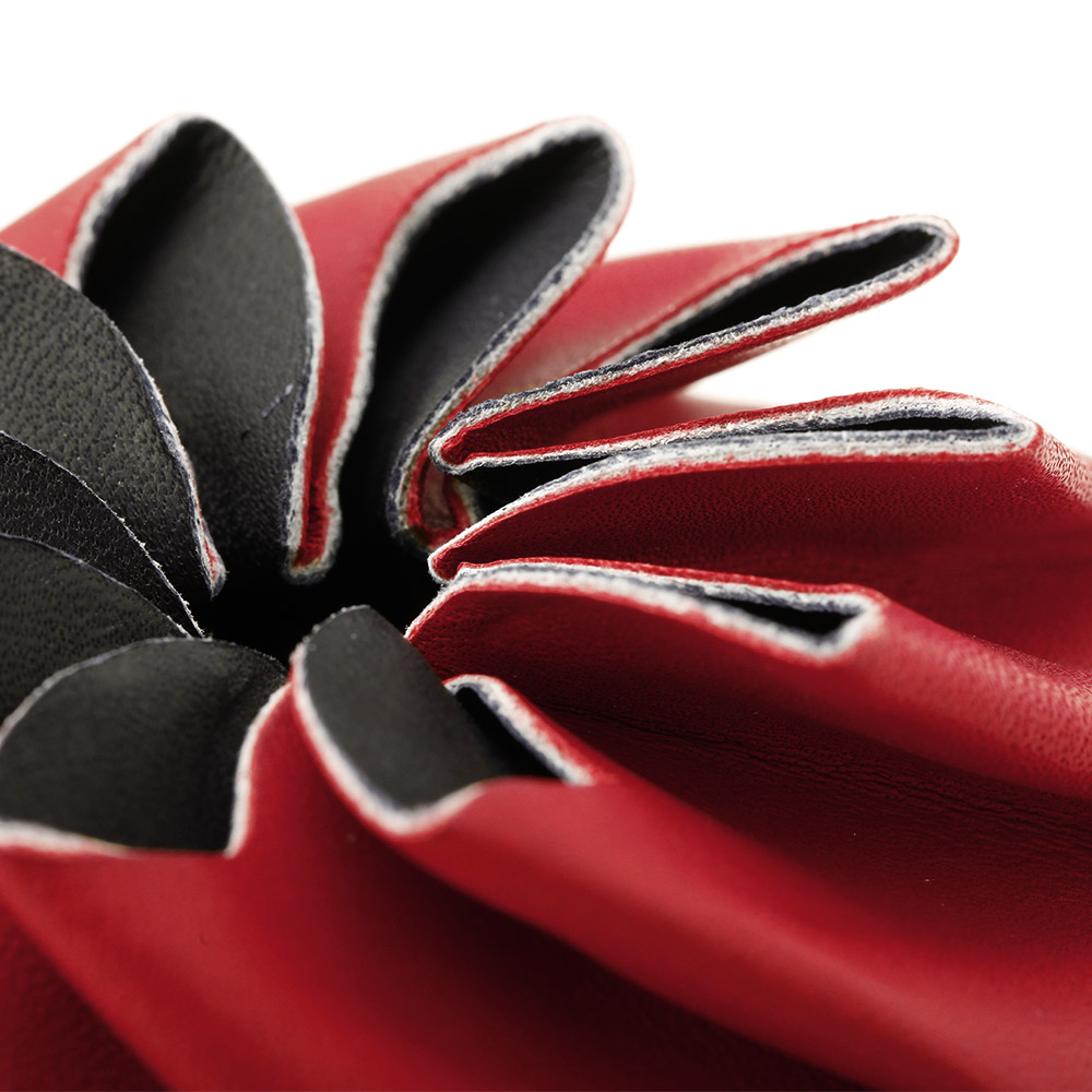 ボタンもファスナーもなく、折りだけでコインを包み、まさに花のように美しい革のケース。