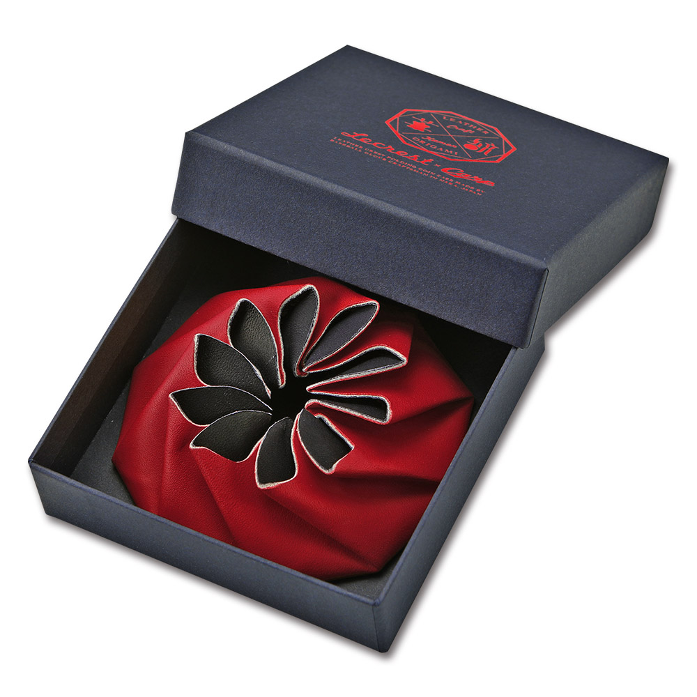 革を極限まで薄く漉き精密に折り込む技術で日本の伝統的な折り紙技法「花紋折り」を革で再現したコインケース”Lecrest(レクレスト)”。